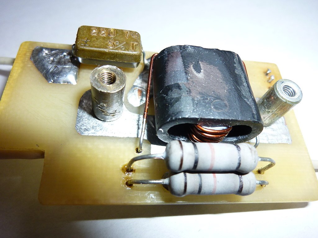 Размещение деталей на плате входного аттенюатора и симметрирующего трансформатора (вид снизу) |